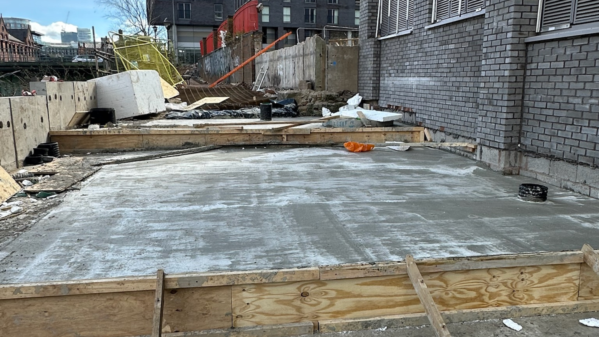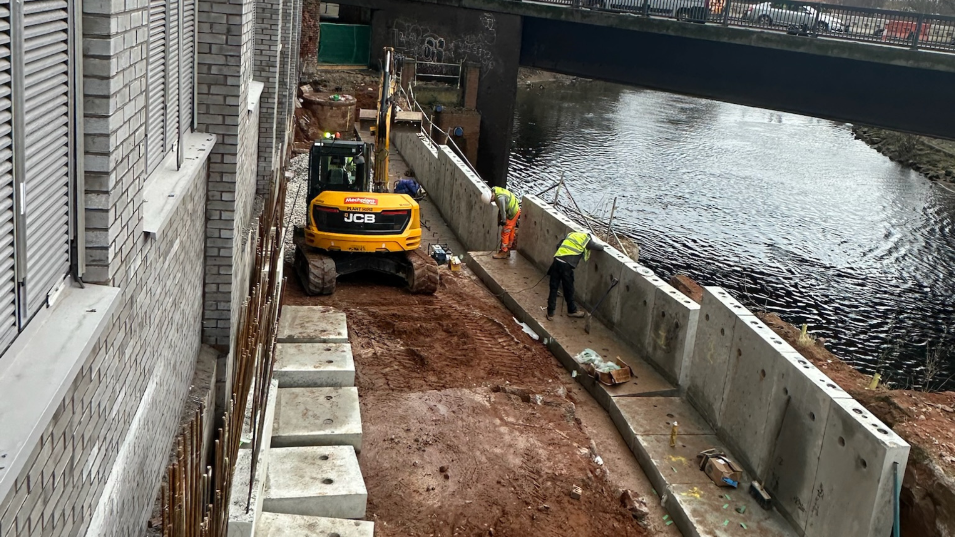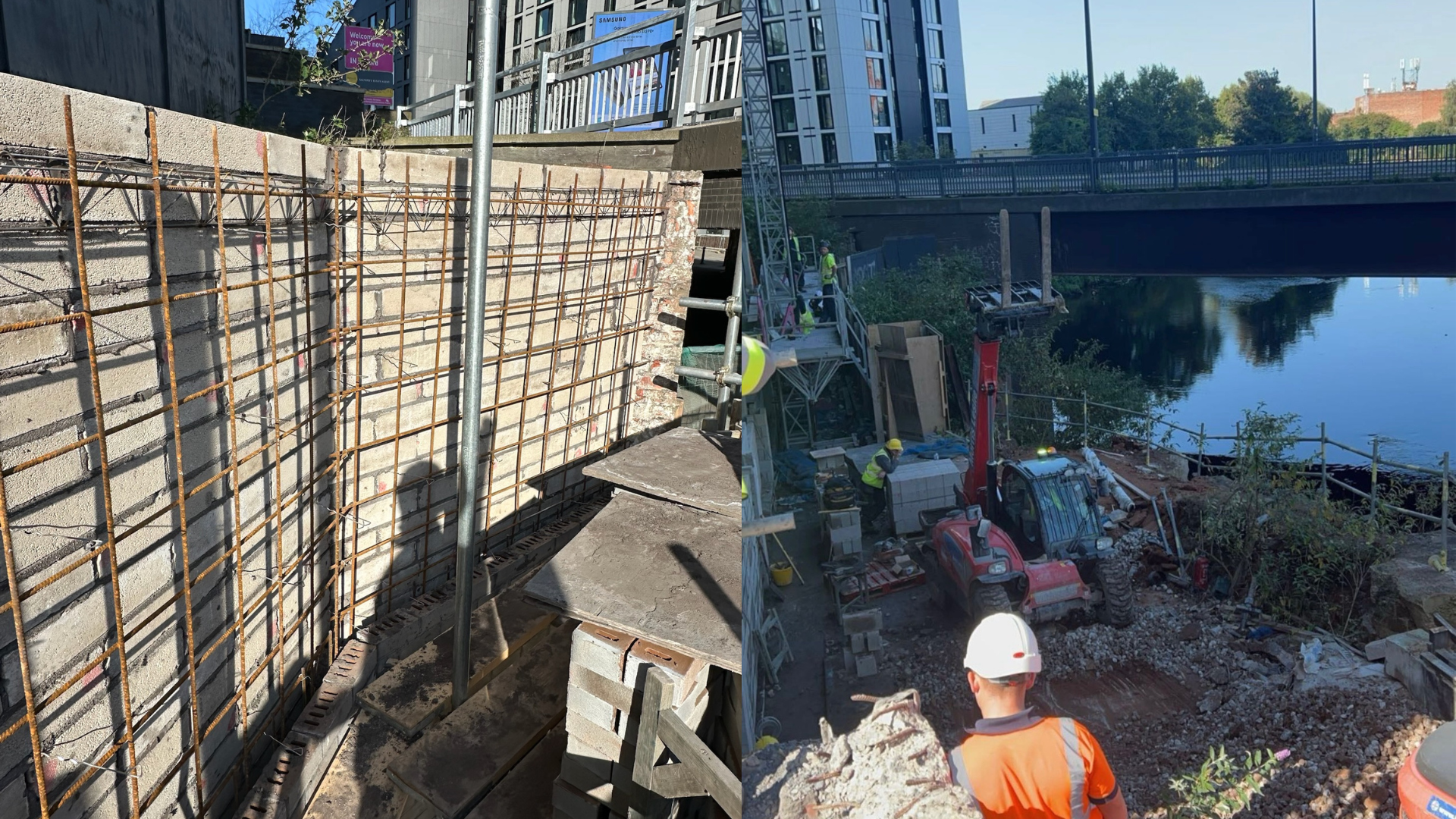 The River Walk phase presented significant access and logistical challenges, requiring innovative thinking and precise sequencing. To establish access, our team broke out existing concrete and carried out a reduce level dig before excavating for reinforced foundations, which included an A393 mesh layer.
